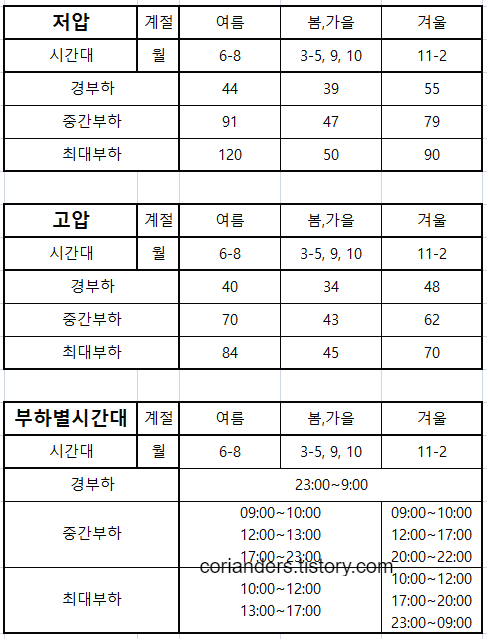 표를 보는 법은 일단 부하별시간대에서 충전하는 월과 시간을 확인해서 계절이 언제인지, 어떤부하시간대인지 확인한다. 그 후 그 계절의 부하시간대별 단가를 위의 표에서 확인한다. 그리고 그 단가와 충전량을 곱하면 나온다.
