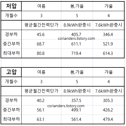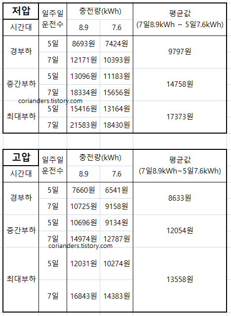 따라서 각 부하별 월평균 충전비는 고압에서 경부하 8633원, 중간부하 12054원, 최대부하 13558원이고, 이 값을 기준으로 최소값~최대값 사이로 충전할 것이다.