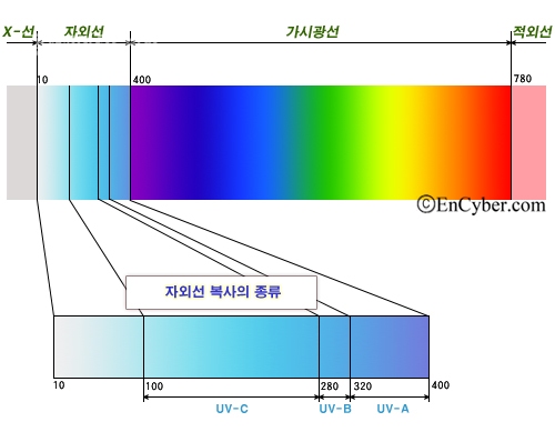 지구에 오는 태양광선은 위와 같이 다양한 파장으로 구성되는데, 실제로 우리 눈에 보이는 것은 가시광선이고 나머지는 눈에 보이지 않는 X-선, 자외선, 적외선 등이다. 그리고 위의 설명대로 X선이 가장 강하고, 자외선, 가시광선, 적외선 순으로 에너지가 낮아진다. 자외선은 파장이 짧지만 높은 에너지를 가진 UVC, 파장이 길고 에너지가 낮은 UVA, 그리고 그 사이의 UVB로 나눌 수 있다. 다행인 것은 UVC와 그보다 파장이 짧은 X선이나 감마선은 지구 대기권에 의해서 흡수되고, UVB, UVA, 가시광선, 적외선 등의 상대적으로 약한 빛만 우리에게 온다.