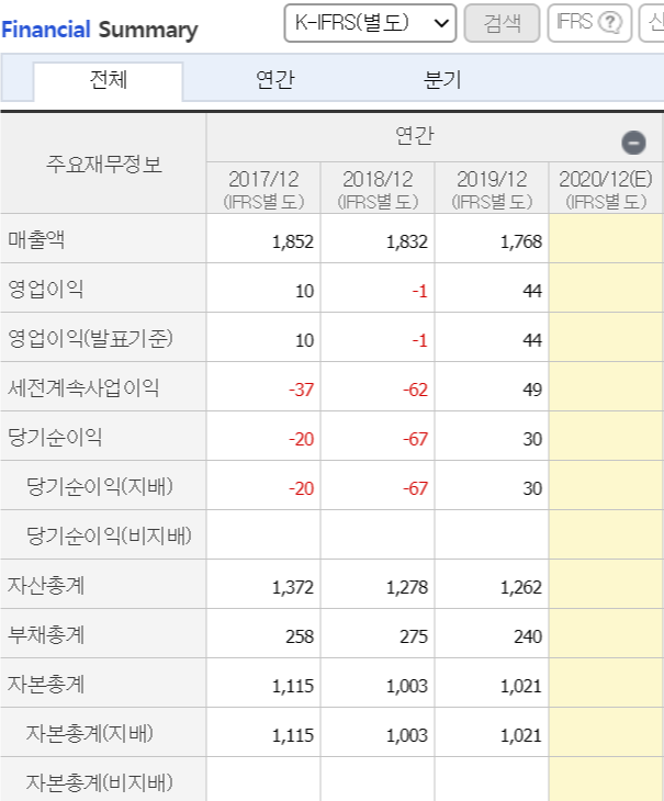 다음은 남영비비안(002070)의 2020년 7월 8일 기준 재무제표 일부이다.