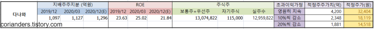 마지막으로 다나와 계산결과다. 주가가 7월17일 기준 29,450원이니, ROE가 21정도를 계속 유지하지 않는 한 적정주가는 감소할 것이다. 미래 성장성을 많이 보는 IT기업 치고는 의외로(?) 주가가 S-RIM계산 결과와 비슷하다는 걸 고려하면 오히려 낮은편이라고 말해야하나...