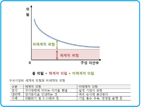우리가 개별 기업에 대해 투자했을 때는 그 개별 기업이 가지고 있는 비체계적 위험과 체계적 위험에 모두 노출되어 있다. 굳이 예를 들자면 어떤 대기업 회장의 비리로 주가가 떨어지거나, 물적분할로 주가가 하락하는 경우가 비체계적 위험이고, 코로나19 사태나, 미중전쟁과 같은 이슈가 체계적 위험이라고 할 수 있다.