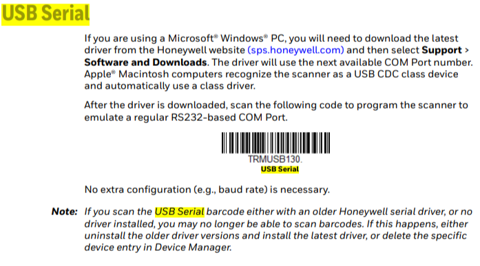방법은 허니웰 공식홈페이지(https://support.honeywellaidc.com/s/article/How-to-get-the-scanner-to-communicate-via-virtual-COM-port-USB-serial-driver)에 나와있다.
