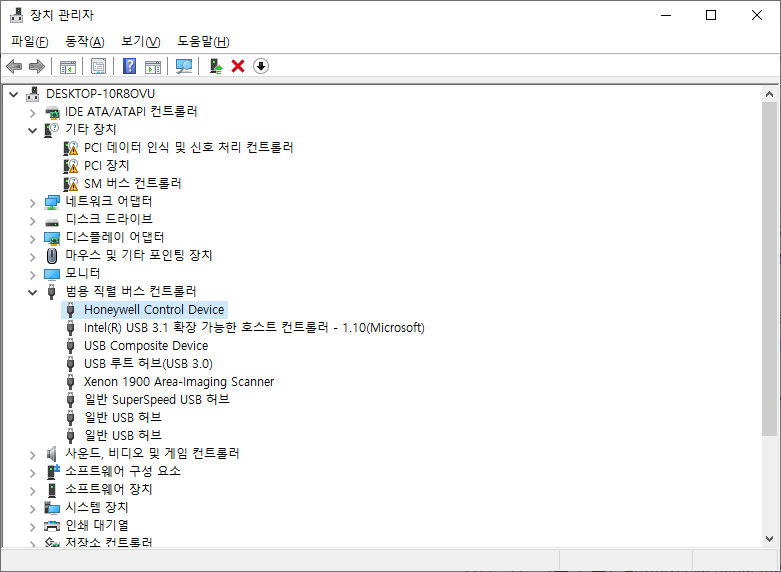 - 범용 직렬 버스 컨트롤러(Universal Serial Bus Controllers)에 'Honeywell Control Device'가 있는지 확인한다. 나오면 정상설치된 것이다.