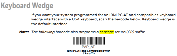 이 중 바코드 스캐너로 데이터를 입력하고, 엔터를 쳐서 바로 다음줄로 커서를 옮기고 싶거나 진행시키고 싶을 때는 캐리지 리턴(Carriage Return)이 첨부된 바코드를 읽어야 한다. 가이드에서 Carriage Return으로 검색하면 해당 기능이 있는 바코드들이 있는데 이중에서 뭔지 모르겠다;