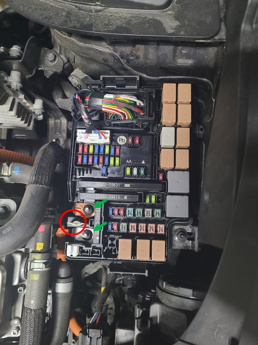 위에 도면을 보면 (+)극이 잘 나와있는데, 퓨즈박스를 처음 만져본 나에겐 정확한 (+)극의 위치를 알 수 없었다. 특히나 두번째 사진의 녹색 화살표 위치에 있는 두 단자가, 마치 시동배터리의 (+)마냥 집게를 물리기 좋은 형태로 되어 있어서 '여기에 물리는건가?'라고 엄청 고민을 했다. 혹시나해서 열심히 찾아보니 퓨즈박스의 가운데 넓적한 부분(빨간 동그라미)에 집게를 물린 사람의 이야기가 있어서 나도 넓적한 부분에 집게를 물렸다. 사실 다른데 하면 어떻게 되는지는 잘 모르겠다. 이쪽으로는 지식이 없으니 다른부분은 그냥 하지말자...