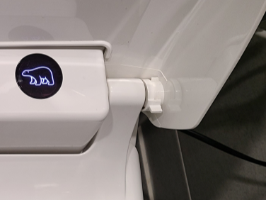 뚜껑과 시트 부분 사이에 돌릴 수 있는 돌출부가 있는 원형 부분이 있다. 실제로 저 작은 손잡이(?)를 돌릴 수 있는데 위로 올리면 비데뚜껑의 우측 부분이 시트와 분리된다. 지금 위 사진은 내가 손으로 돌려서 열리도록 한 상태다.
