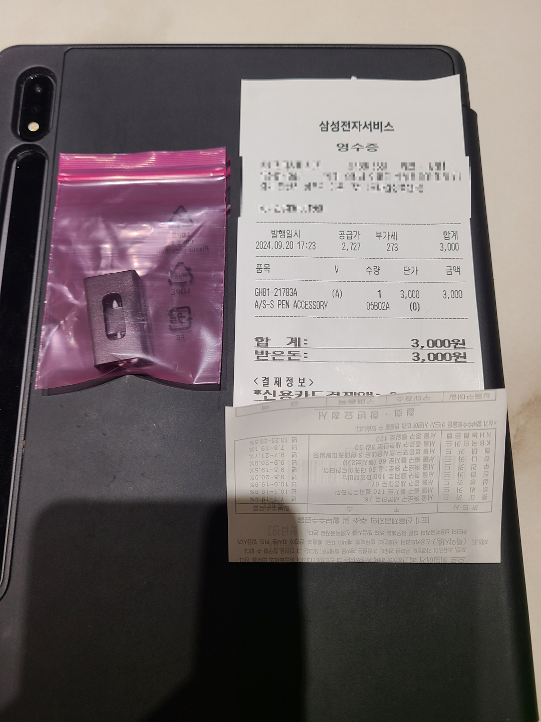 삼성스토어에 가서 구매했다. 여기만 그런건지는 모르겠지만 1층의 여러 액세서리와 제품이 판매된 곳에서 찾으니 AS센터에 가서 사라고 했다. 위층으로 올라가서 AS센터에 가니 부품만 파는 코너가 있어서 금방 구매했다. 별도로 패키징이 되어 있진 않고 지퍼백에 담아서 주었다. 3천원이었고 회색과 검은색 펜촉이 함께 있었으니 2개를 3천원에 구매한 셈.